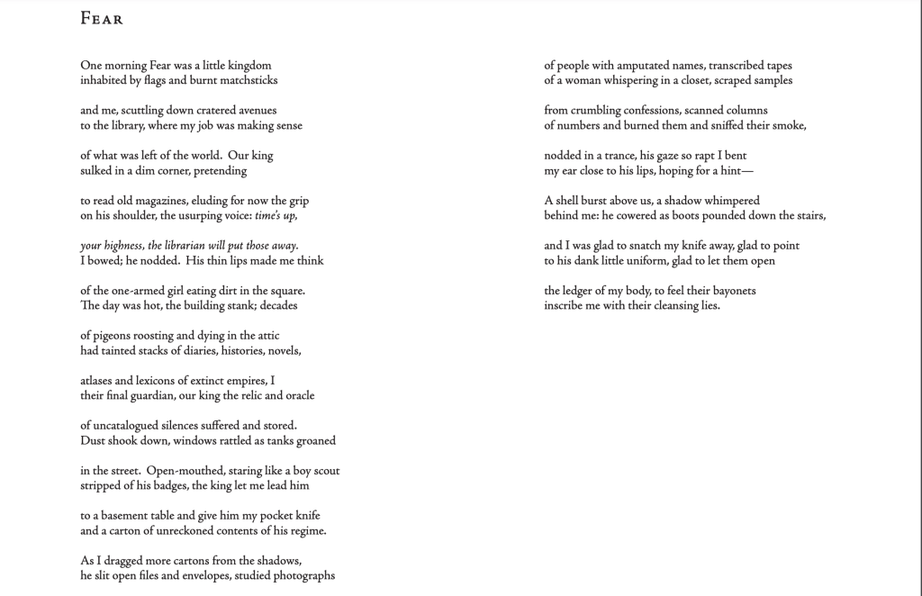 Many thanks to Witness, where “Fear” originally appeared, and to The Word Works, with very special gratitude to Leslie McGrath (1957-2020), founding editor of the Tenth Gate imprint.